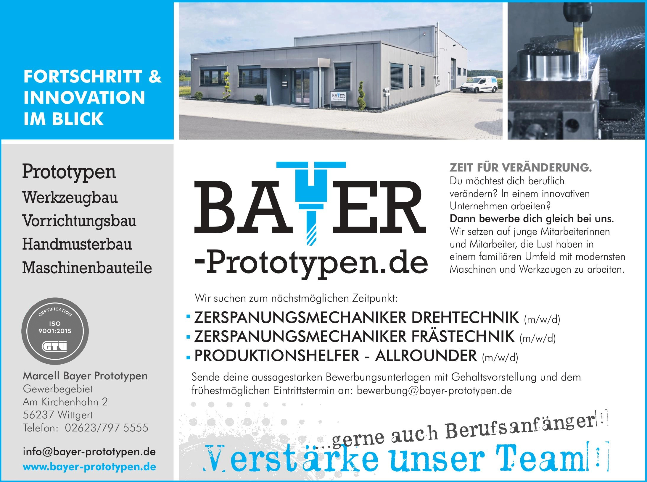 Wir setzen auf junge Mitarbeiterinnen und Mitarbeiter, die Lust haben, in einem familiären Umfeld mit modernsten Maschinen und Werkzeugen zu arbeiten. In unserem 2019 neu erbauten Firmengebäude bieten wir dir dafür optimale Bedingungen. Bei uns steht die Tür jederzeit offen, wir bauen auf unsere Mitarbeiter und Mitarbeiterinnen und setzen auf deren Eigenverantwortung.